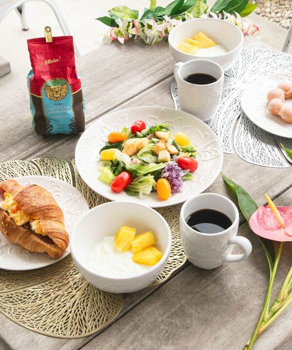 モンステラとホヌの模様がとっても素敵でハワイでの朝食を思い出させてくれます