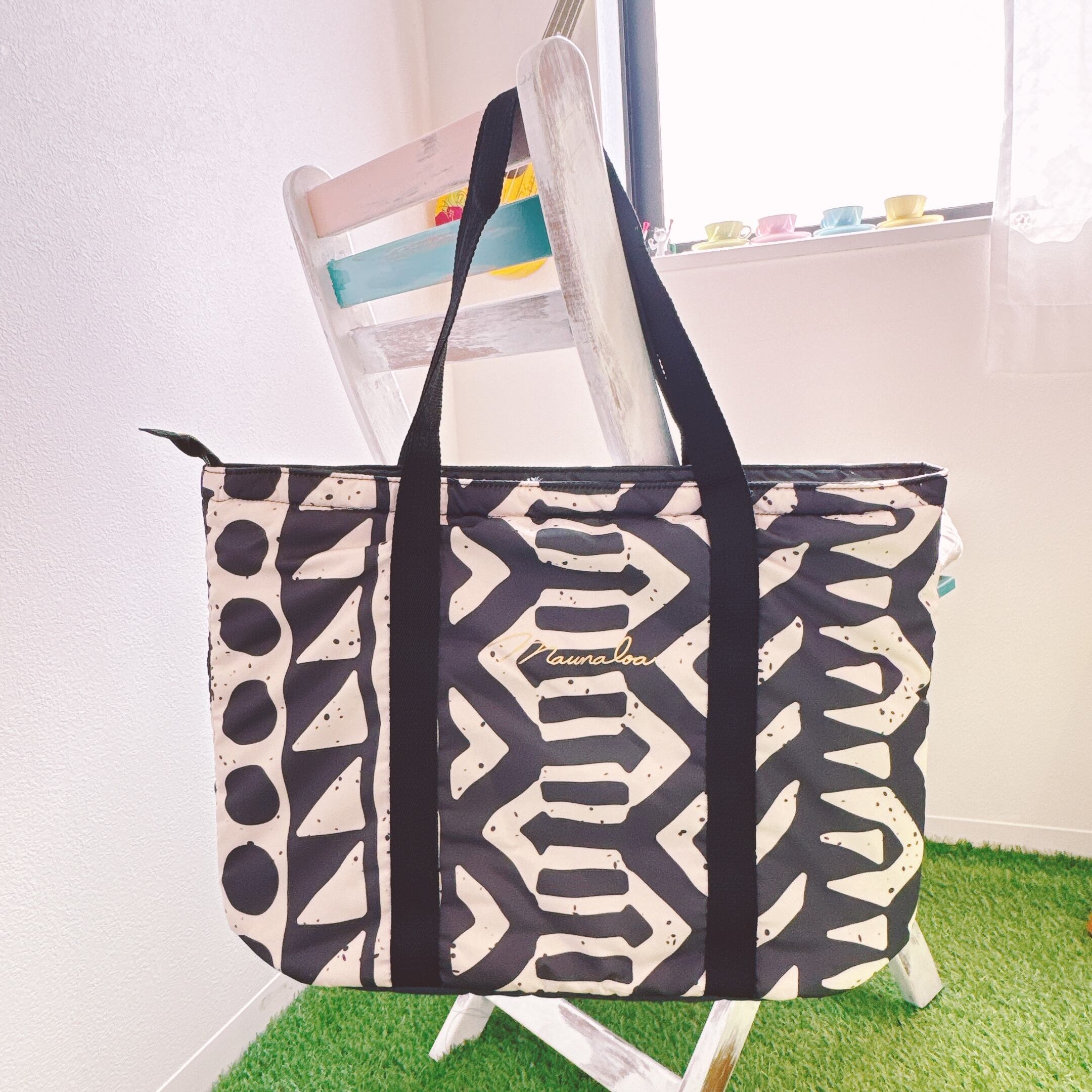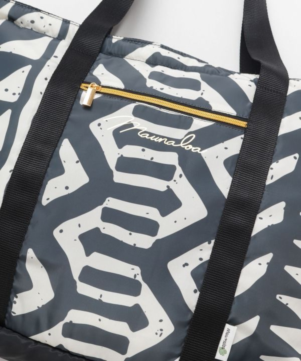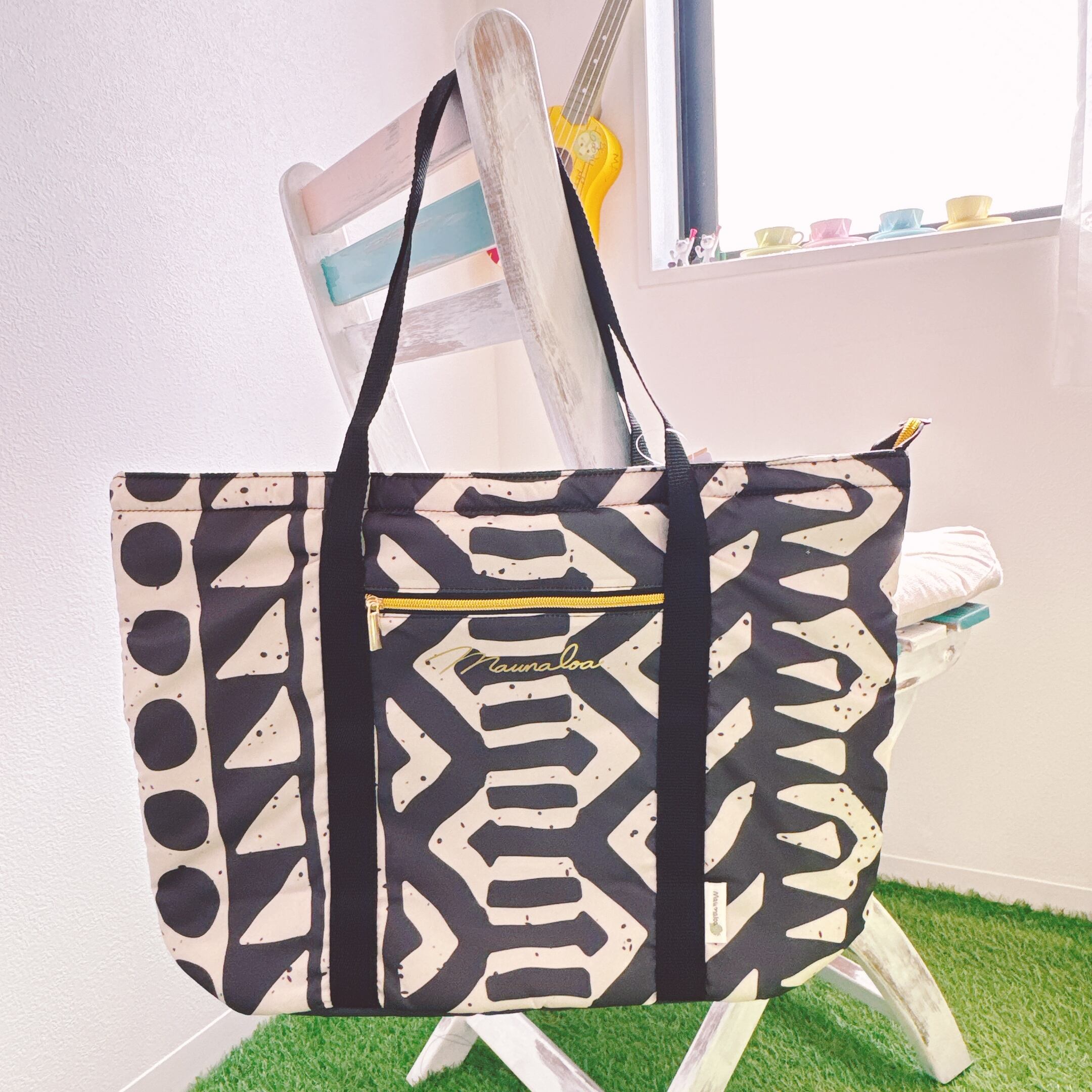 ブラックは伝統的なタパ柄が描かれた大きめのフラのレッスンバッグ