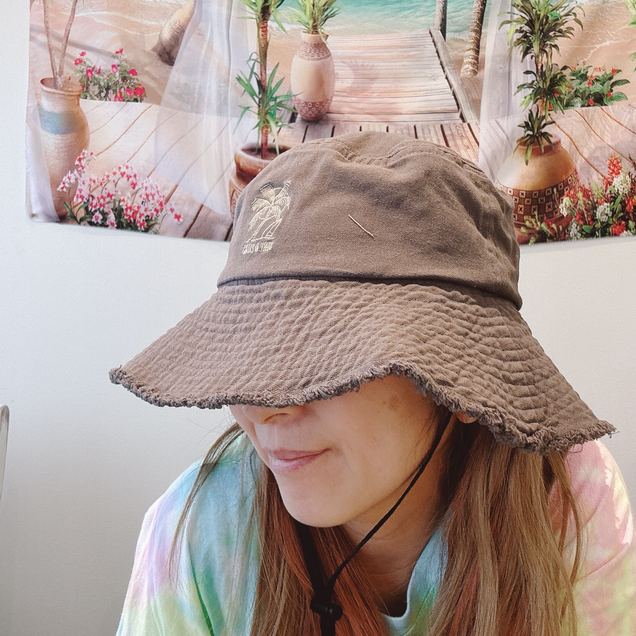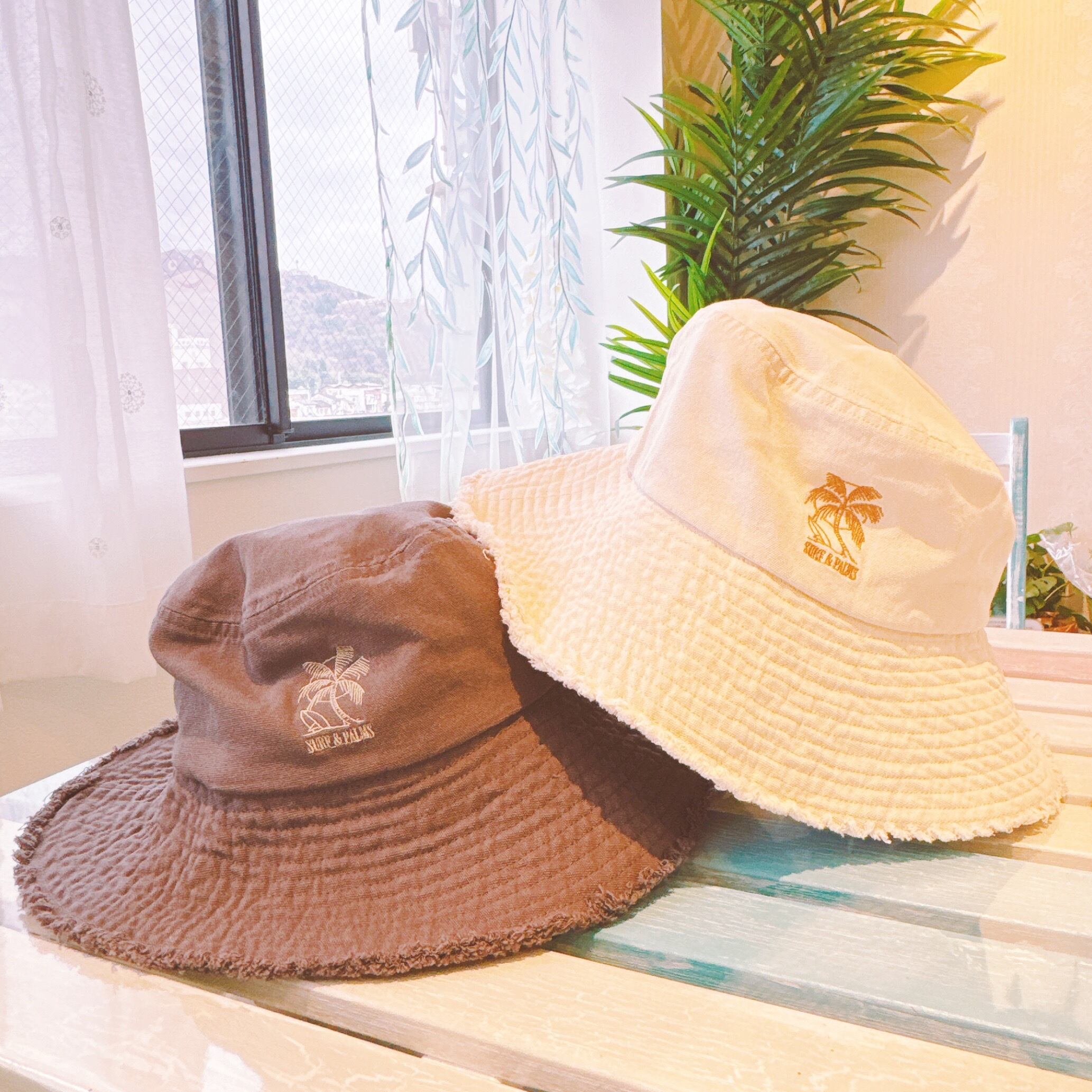 縁のフリンジとパームツリーの刺しゅうが可愛いALOHAコットンハット【ベージュ・グレー】