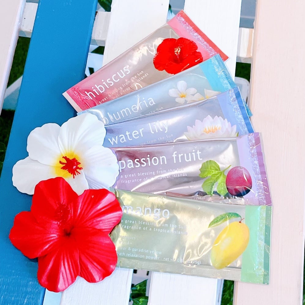 ハワイの香りを楽しめる♪香りも見ためもハワイアンなカラフルな入浴剤 5つの香りのセット売り